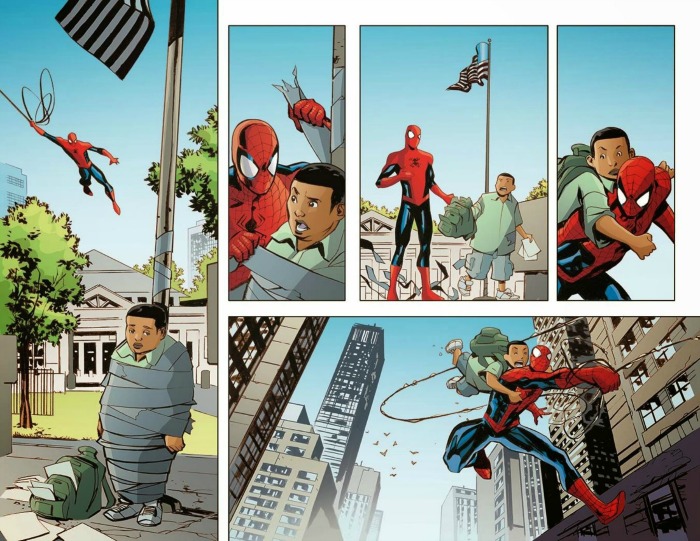 Spiderman aparece en “Amigos en la Red”, dibujada por Marcio Takara y en la que Gerry Duggan se encarga del guion. En ella presenciamos una conversación del trepamuros con un chico víctima del bullying y cómo Spidey empatiza con él. A destacar la idea introducida de que la figura del abusón no es más que alguien inseguro con afán de reconocimiento y de lo fácil que puede pasar un acosado a ser un acosador.