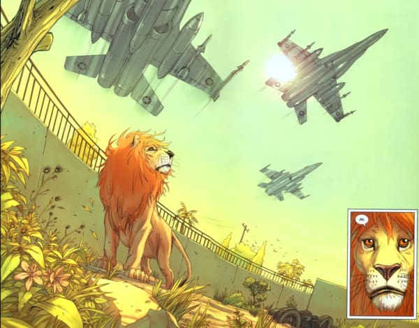 Bajo esta premisa Brian K. Vaughan (Saga, Paper Girls), nos transporta a un Bagdad en plena guerra de Irak (año 2003, recordemos) junto a Niko Henrichon al increíble apartado gráfico. Pero lo más acertado de esta obra, al menos para mí, es que los protagonistas no son humanos, sino leones. Esto le da al cómic un punto de ternura que, quizá con humanos, muy posiblemente no se llegaría a transmitir al lector. Por ejemplo, a mí me puede caer bien alguien que al resto le podría resultar apático. Pero como ya hemos comprobado en numerosas películas de animación, el resultado con animales suele ser más satisfactorio y llega más a la «patata» del (en dicho caso) espectador.