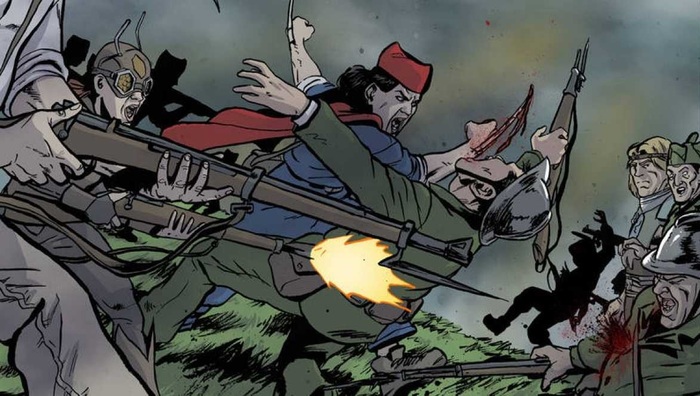 Agrandando el espectro de este universo que mezcla lo superheróico con los hechos históricos, Carmona en Viñetas editó el pasado noviembre en formato grapa “1937: La Toma de Málaga”, con guion de Roberto Corroto (“Sicarios” o “Mascarada”), dibujo de Román López-Cabrera (“Miguel Hernández, La Fontana Eterna” o “Secret Family”) y color de Marina Armengol. Los hechos históricos que sirven de escenario al argumento son los siguientes: en los primeros días de febrero de 1937, en plena guerra civil española, una de las ofensivas más letales que perpetró el bando sublevado, con ayuda de tropas italianas, fue la ofensiva sobre Málaga. En menos de una semana Málaga capituló, originando un éxodo de refugiados hacia Almería, que desembocó en “La Desbandá”, con un recuento de bajas, dependiendo de las fuentes, de entre 3.000 y 5.000 ciudadanos, en su mayoría civiles, provocado por las tropas sublevadas al atacar la carretera que unía Málaga con Almería durante la huida de los republicanos. Es en este contexto histórico donde se sitúa la historia, centrada exclusivamente en la batalla por la toma del control de Málaga. Aquí descubrimos al personaje principal: Najar, un superhumano con habilidades de teletransporte que forma parte, junto a Colmena, Jineta o Culebra, del batallón de “Especiales” que dispone el ejercito republicano para defender la posición de Málaga ante las tropas sublevadas y el Corpo Truppe Volontaire italiano.