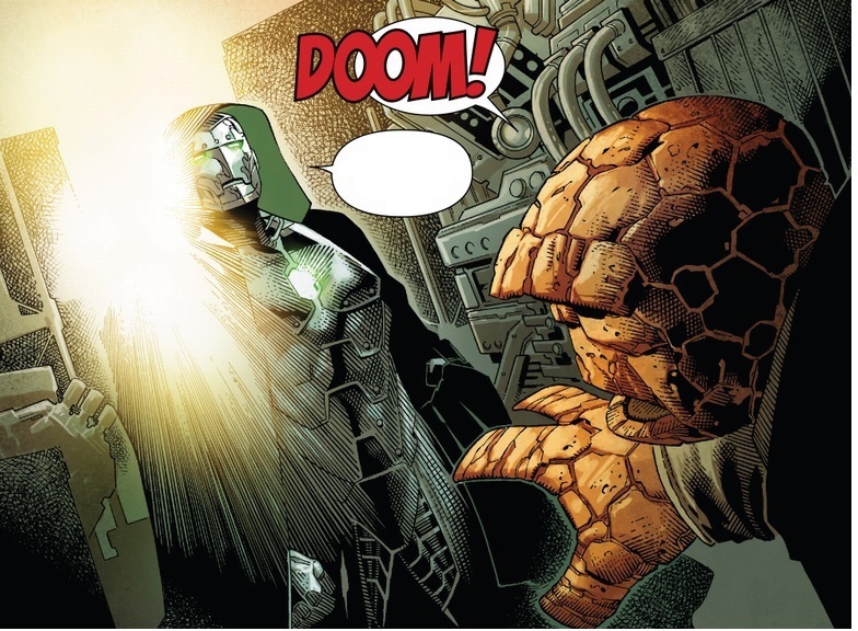 Todo parece indicar que nos espera un “Verano Fantástico”. Antes de ello, “La Casa de las Ideas” ha cuidado la estrategia con mimo y ha diseñado un invierno y primavera “pre-fantástico” con una apuesta donde apela a la expectación – y a la nostalgia de los lectores más veteranos – resucitando una cabecera emblemática como “Marvel Two-In-One”. Decisión acertada, ya que aquella serie que duró 100 números y 7 anuales entre 1974 y 1983 estaba protagonizada por Ben Grimm haciendo “team ups” con diversos héroes del universo Marvel. Para esta ocasión el socio que acompaña a la adorable cosa de ojos azules no es otro que su flamígero amigo y compañero durante décadas en el edificio Baxter: Johnny Storm, la Antorcha Humana. Y para elevar la expectación, el arco argumental con el que se inicia la serie y que compone seis entregas lleva por título “El destino de los Cuatro” – “Fate of The Four”. Todos estos elementos nos llevan a la antesala del regreso más esperado en la casa de las ideas. No obstante, cabe destacar que para Junio ya está anunciado por parte de Marvel el séptimo número de la serie donde se inicia un nuevo arco argumental y un anual donde La Cosa compartirá protagonismo con Victor Von Muerte.