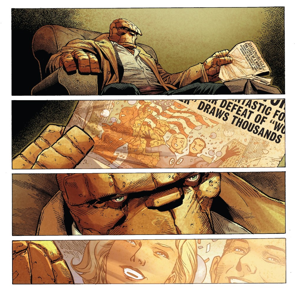 Zdarsky aporta frescura en la premisa de partida: contemplaremos cómo les ha afectado a Johnny y a Ben la ausencia del resto de miembros de la primera familia. La adorable cosa de ojos azules se embarcará en la tarea de sacar de la zozobra anímica a un Johnny Storm depresivo por las ausencias de Reed, Sue, Franklin y Valeria. Y para ello, como en los mejores tiempos de los 4F, toca explorar y viajar, encontrarse con viejos conocidos como el Doctor Muerte o el Hombre Topo, entre otros, y con varios héroes del universo Marvel. Todo ello llevado con los suficientes puntos fuertes en un guion solvente plagado de momentos brillantes tanto emotivos como nostálgicos, pero sorprendentemente frescos. También habrá momentos para la comedia, sabiamente dosificados por parte de Zdarsky.
