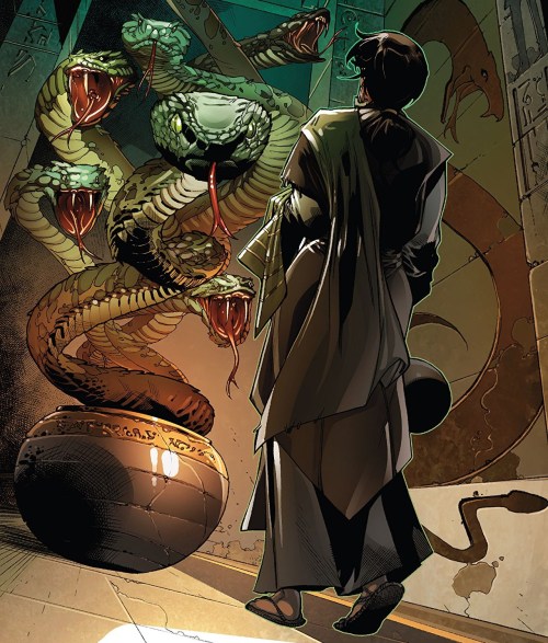 El cómic que nos ocupa hoy, que junta los mundos de Robert E. Howard con los personajes de Marvel Comics, nos brinda algo cuanto menos interesante. Para empezar, en Conan Serpent War se nos llevará de la mano por un recorrido a través de las líneas de tiempo como si de unos “Cuentos Salvajes” se tratase. De la mano del guionista Jim Zub (Glitterbomb, Pathfinder) a personajes como Conan “El cimmerio”, el errante Solomon Kane y la corsaria Dark Agnes (presentando a cada uno de ellos con unas escenas detalladas y con gran cantidad de referencias) se unen a las creaciones del universo 616 de Marvel Comics como Marc Spector (Caballero Luna) y otros.