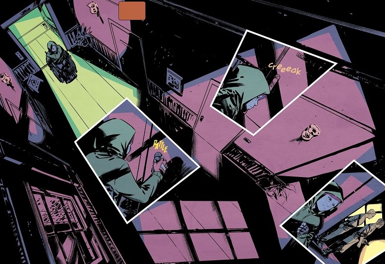 Dicho o cual, que no es precisamente poco , es en lo gráfico cuando el cómic traspasa la línea de su target para ser una obra destacable para cualquier aficionado. Pues estamos ante un trabajo por parte de Manuel Preitano y Jordie Bellaire para quitarse el sombrero. Preitano nos va a ir cautivando con unas páginas y composiciones más que efectivas, mientras que adopta un estilo que a más de un lector veterano le evocará al maestro David Mazzucchelli. En cuanto al color, Preitano y la inigualable Jordie Bellaire (“El Regreso del Caballero Oscuro: El Chico Dorado”, «Catwoman» “The Banks” o “Bella Muerte” nos regalan algún que otro festín para los ojos. Sirva de ejemplo ese paseo nocturno por Arkham , donde el violeta predomina e intensifica la composición de página de Preitano.