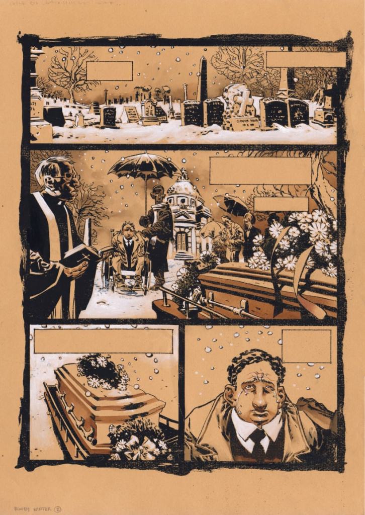 Bleda afirmó una vez que los “story”, bocetos iniciales, son la parte más difícil e importante de este proceso creativo. Estos se puede describir como unos garabatos “rápidos” que indican como se distribuirán las viñetas en cada página, que plano se utiliza en cada escena sin que llegue a quedar recargado. Lo que marcan los bocetos menos trabajados realmente es el ritmo narrativo de toda la obra. En el caso de «Bloody Winter» Bleda aprovechó al máximo ese potencial narrativo que se ven en las viñetas horizontales. Aunque parece ser que estuvo limitado por el editor que tenía en ese momento, al disponer de solamente de cuatro viñetas por página. Lo cual obligó a sintetizar al máximo y seleccionar muy detenidamente lo que quería que apareciera en cada uno de los dibujos. Quizá sin esa limitación, se podría haber llegado más lejos en lo contado.