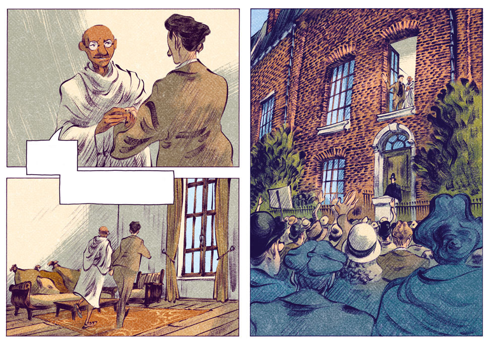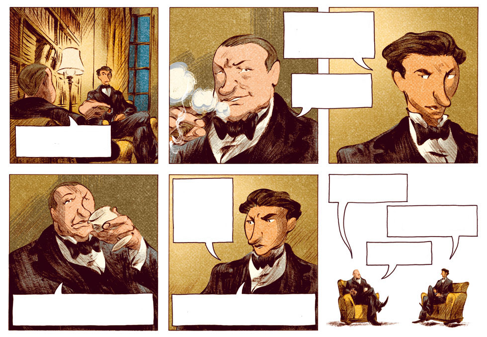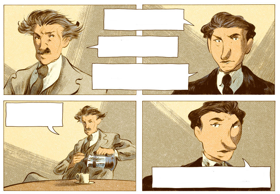 En la parte artística tenemos a David François. Nacido 1983 en Amiens, su formación es autodidacta, pasando sus años de educación ennegreciendo los márgenes de sus cuadernos. A pesar de una fe inquebrantable en un futuro con la formación de científico, todavía mantenía su cuaderno de bocetos bajo el brazo. Después de varios trabajos, su implicación en Chaplin lo colocó como el mayor esfuerzo (y el de mejores resultados) de su carrera artística, con tres volúmenes en gran formato. Su estilo de dibujo mezlca lo realista con un estilo similar al de la animación, resultando la combinación muy interesante. En el tebeo que hoy nos ocupa hay varias muestras de ello, desatacando las splashs pages que hacen que alucines con la calidad de las páginas y disfrutes todos los detalles.
