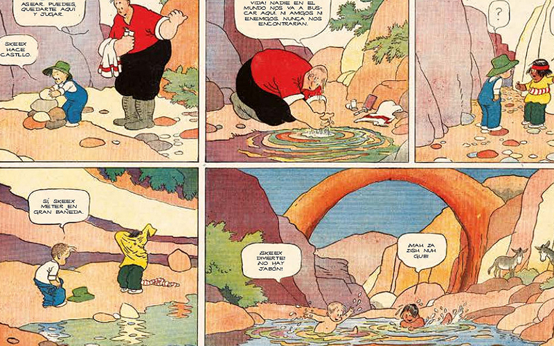 La obra se llama realmente “Gasoline Alley”, y dado que empezó a publicarse en la página dominical “The Rectangle” del periódico Chicago Tribune nada menos que en 1918, no es de extrañar que sea la segunda tira de cómic en prensa más longeva en Estados Unidos tras “Katzenjammer Kids”. La sección dominical de “Gasoline Alley” destacó por su calidad artística y su formato innovador. King fue uno de los primeros dibujantes en utilizar el formato de página completa para sus tiras cómicas dominicales, lo que le permitió crear historias más elaboradas y detalladas. La tira se centra en la vida cotidiana de una pequeña comunidad urbana y los personajes que la habitan. Walt Weatherby Wallet es el personaje principal del relato. Es un mecánico de automóviles y propietario de una estación de servicio. Walt es un personaje amable, generoso y comprensivo, y se preocupa profundamente por su familia y amigos. También es un hombre nostálgico, a menudo recordando los viejos tiempos y la forma en que solían ser las cosas. Tras varias tiras hubo un giro de guion que llevó al autor a introducir al personaje definitivo: Skeezix, un bebé abandonado en la puerta de nuestro protagonista que cambió para siempre el tono de la serie y supuso el inicio de su genialidad. Cuando Walt lo encontró en su estación de servicio, decidió adoptarlo y criarlo como si fuera su propio hijo. Skeezix es un personaje interesante porque va cambiando a medida que la tira avanza. Comienza siendo un bebé, pasando por todas las fases de crecimiento. Al tiempo tenemos varios personajes que interactúan con nuestros protagonistas, en conjunto estos actores (tanto humanos como animales) representan una comunidad unida y amorosa, donde la amistad y la familia son muy importantes. Y justo ahí es donde comienza este libro: en las que Frank King adapta su discurso precisamente a esos domingos en que toda la familia disfrutaba antiguamente de los periódicos, cada uno con su sección de papel.