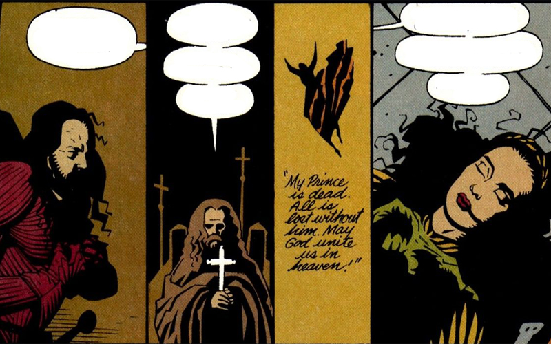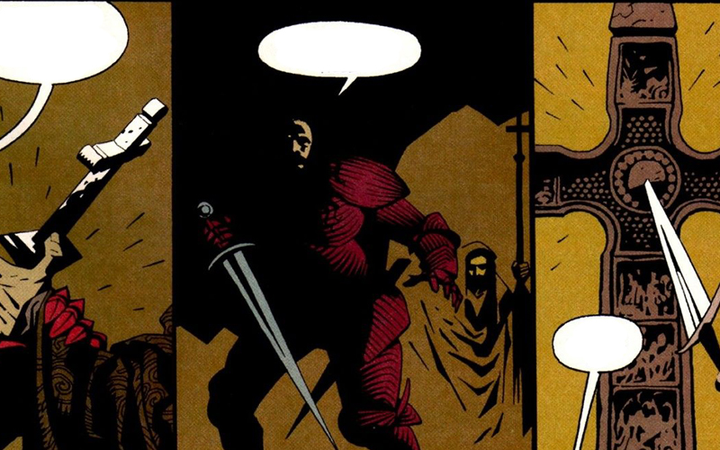 El arte de Mike Mignola en este cómic es verdaderamente excepcional y se destaca por su estilo distintivo y su capacidad para crear una atmósfera oscura y cautivadora. Su contribución visual a la adaptación del clásico de Bram Stoker es fundamental para transmitir el horror y la belleza macabra de la historia. El estilo de dibujo del creador de “Hellboy” es reconocible al instante: líneas gruesas y negras, sombras profundas y composiciones visualmente impactantes. Su enfoque minimalista y su uso efectivo del espacio ayudan a establecer una atmósfera opresiva y misteriosa que es perfecta para una historia de vampiros. Este dibujante logra capturar la esencia del horror gótico en cada página, creando imágenes icónicas y evocadoras que se quedan grabadas en la mente del lector. Además de su habilidad para crear imágenes impactantes. Este autor es un maestro en la creación de personajes visualmente intrigantes y expresivos. Las tintas de John Nyberg aportan una profundidad y una textura excepcionales al arte de Mike Mignola. Su habilidad para utilizar las sombras y los detalles en las ilustraciones realza la atmósfera oscura y misteriosa de la historia. Nyberg captura de manera experta los contrastes entre luces y sombras, resaltando los contornos y los detalles importantes. Su trabajo de entintado aporta una sensación de peso y solidez a los personajes y escenarios, creando una experiencia visual impresionante. Por otro lado, Mark Chiarello utiliza una paleta de colores cuidadosamente seleccionada crea una atmósfera sombría y siniestra que envuelve al lector en el mundo del chupasangre. Los tonos oscuros y apagados refuerzan el ambiente gótico de la historia, mientras que los toques de rojo intenso resaltan la presencia de Drácula y su sed de sangre. Chiarello utiliza el color de manera efectiva para acentuar los momentos clave y crear contrastes dramáticos en las viñetas.