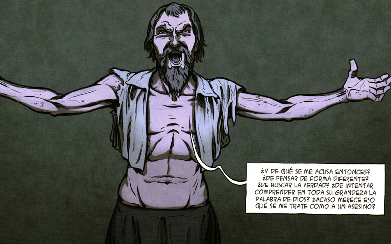 En el tebeo que tenemos entre manos Javier Marquina nos ofrece con sumo detalle la vida de Miguel Servet. Marquina tiene un estilo narrativo peculiar que algunas veces combina elementos de fantasía, ciencia ficción y aventura, si bien en este trabajo centra el enfoque en un tono realista para dar con una acertada biografía de Servet en viñetas. Uno de los aspectos destacados de los guiones de Javier Marquina es su capacidad para crear personajes complejos y veraces. Sus protagonistas suelen tener motivaciones profundas y enfrentar desafíos emocionales, lo que les otorga una dimensión humana. Además, Marquina se enfoca en desarrollar relaciones interpersonales convincentes entre sus personajes, lo que agrega capas de profundidad a sus historias. Otro elemento distintivo de los guiones de Marquina es su atención meticulosa al detalle. Sus descripciones minuciosas de escenarios y ambientes permiten que los dibujantes e ilustradores visualicen fácilmente sus ideas y las plasmen en el arte. Además, su habilidad para construir la estructura de la historia de manera coherente y equilibrada garantiza una narrativa fluida que robustece sus propuestas.