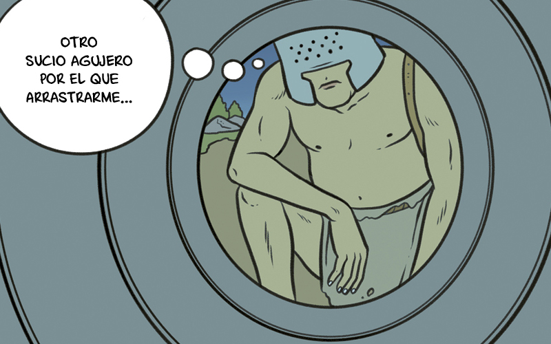 En el tebeo llamado “Fuego de Bengala” de David Sánchez veremos a ese hombre que, con cada giro y cada bifurcación, busca desesperadamente algún indicio, algún símbolo que lo guíe hacia adelante. Cada marca parece ser una clave, una pista crucial en esta travesía que desafía los límites de lo conocido. Pero, mientras avanza, el enigma se vuelve más profundo, más complejo. Y con cada paso que da, una inquietud empieza a surgir en su mente. El hombre con casco se detiene en medio de un cruce de caminos y mira a su alrededor, sumido en pensamientos introspectivos. ¿Qué hay más allá de este laberinto? ¿Acaso hay un último nivel o es solo una ilusión creada por su deseo de alcanzar una meta aparentemente inalcanzable? La infinitud de la existencia parece abrumadora, y la mente del hombre con casco se ve sumida en una lucha interna. Mientras busca respuestas, la inmensidad del laberinto se vuelve un reflejo de los misterios del universo y la naturaleza infinita de la realidad. El mundo a su alrededor es un recordatorio constante de que hay más de lo que los ojos pueden ver y más allá de lo que la mente puede comprender. La obsesión por llegar al último nivel, como si de un videojuego se tratase, se convierte en una reflexión profunda sobre cómo nuestra mente puede crear límites imaginarios que nos impiden ver la vastedad de posibilidades que nos rodean. La obra de David Sánchez es una verdadera maravilla que nos invita a cuestionar las fronteras de la percepción y la comprensión. A través de lagartos guerrero o patos humanizados, nos sumerge en un mundo surrealista donde la realidad se desdibuja y se mezcla con la fantasía, recordándonos que las historias pueden adoptar cualquier forma y no están limitadas por las convenciones tradicionales.