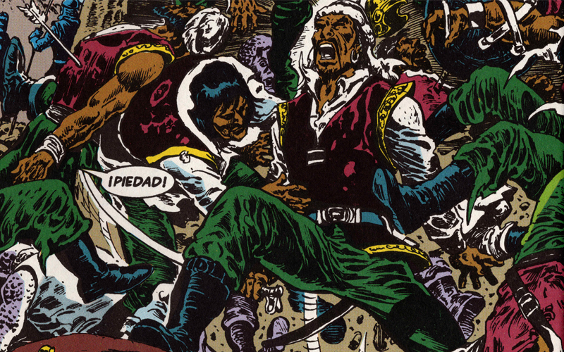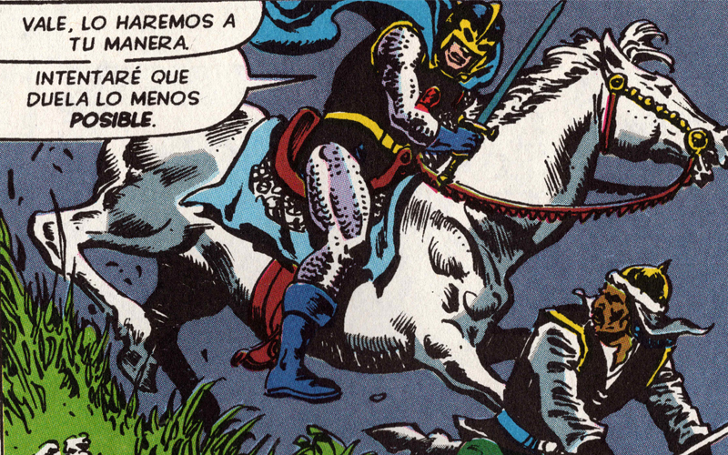 Los dibujantes, encabezados por Scott Hampton y Ernie Chan, merecen un reconocimiento especial por su contribución a este cómic. Hampton y Chan trabajan juntos para capturar la atmósfera medieval con detalles exquisitos y junto con los coloristas utilizan una paleta de colores que evoca la riqueza y la autenticidad de la época. Los paisajes de la llamada “Tierra Santa”, campos de batalla o los campamentos de soldados sumergen al lector en la Edad Media de una manera real y envolvente. Además, el diseño de personajes, desde los guerreros hasta las criaturas místicas, refleja la atención meticulosa al detalle y la creatividad que han sido una característica distintiva de la serie Caballero Negro. Desde mi punto de vista, John Buscema, aunque aparece en pocas páginas, hizo que comprara este tebeo sin dudarlo. La portada de Rafael Fonteriz con la que puso a la venta Forum la edición en castellano en 1998 eleva el volumen a una pieza a atesorar por el aficionado. Dentro esperaban la compilación de historias publicadas originariamente en Marvel Fanfare #52 a #54 y en Marvel Comics Presents #73, en 1990 y 1991, respectivamente. Fonteriz en su portada sintetiza de forma eficaz lo que aguarda el tebeo en su interior.