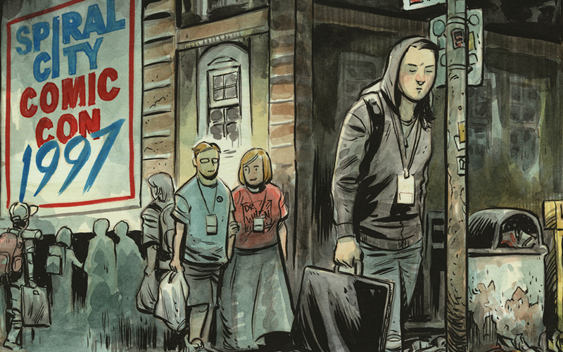 En cuanto al dibujo, Crook tiene una maestría excepcional en la creación de escenas detalladas. Sus ilustraciones están llenas de texturas y detalles minuciosos que dan vida a los mundos que crea. Desde paisajes rurales y entornos siniestros hasta interiores acogedores y oscuros, cada viñeta está meticulosamente diseñada para sumergir al lector en la ambientación de la historia. Como en este caso que nos muestra como trabaja desde el formato de ilustración de un comic de los 80 con sus páginas amarillentas hasta el realismo de la vida de una dibujante de comic y lo que sucede en las convenciones de tebeos. La diferencia de estilo que utiliza este dibujante mientras avanzas en el tebeo, se ve cuando pasas del “tebeo” que se recrea a la realidad imperante de los protagonistas. Según el mismo reconoce: en este tebeo empezó con los lápices digitales del Clip Studio. Saca esa impresión en papel y hace una pasada con tintas aguadas muy básicas. De esa manera funciona como una pintura subyacente. Posteriormente utiliza acuarelas para colorear y dar sombra a las imágenes. Y por último utiliza tinta opaca para marcar los negros y reforzar los contornos de las formas.