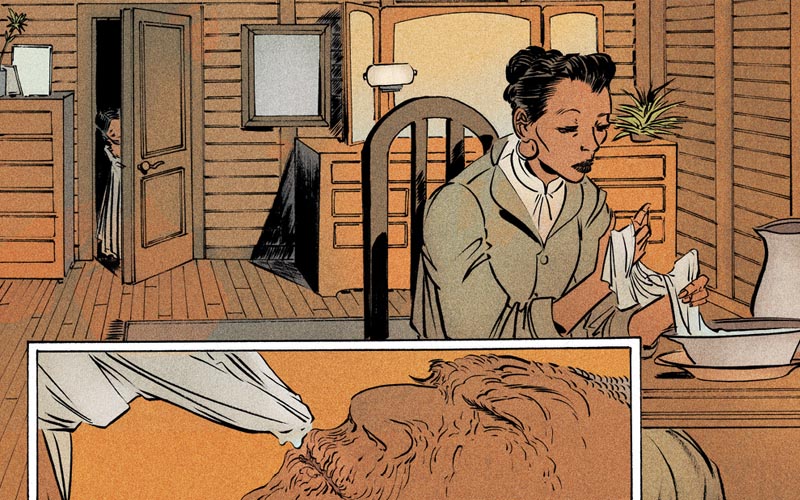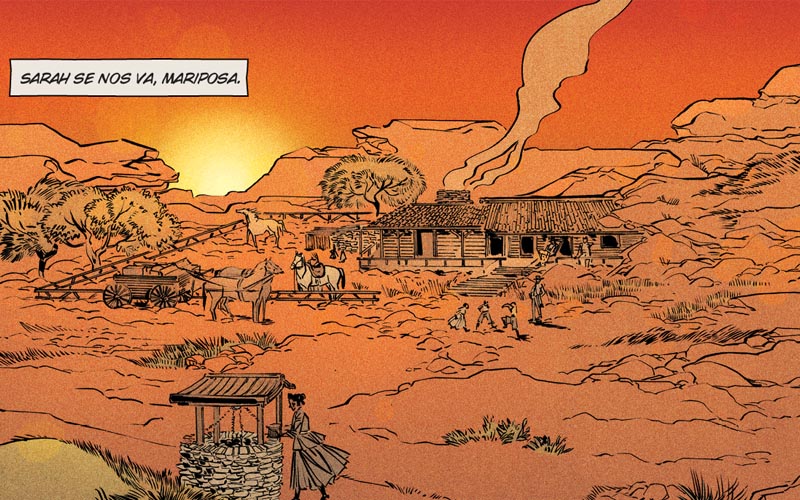 El arte de Emma Ríos en este cómic es una exhibición magistral de su talento y creatividad como dibujante. Con trazos elegantes y detallados, Ríos crea escenas alucinantes que parecen saltar de las páginas. Su manejo del diseño de personajes es excepcional: desde la pobre anciana postrada en la cama hasta los soldados en la trincheras de la zona de guerra más cruenta que te puedas imaginar. Cada personaje cobra vida bajo el lápiz y la tinta de Ríos. Su habilidad para jugar con el diseño y la disposición de las viñetas crea una narrativa visualmente muy dinámica. A menudo, incorpora imágenes simbólicas y elementos metafóricos en su trabajo, lo que agrega ese punto adicional en lo que representa y su significado, aumentando el impacto del relato. En esta historia está muy presente los efectos de sonido, que guían al lector a la siguiente viñeta, en un sentido muy similar al manga. En cambio, utiliza el silencio en las escenas más dramáticas, como si todo fluyera mejor en esos duelos a espada , remitiendo ese recurso empleado a las antiguas películas de samuráis.