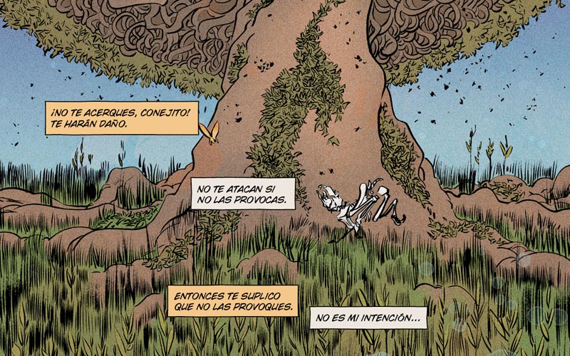 Una de las marcas distintivas del estilo de escritura de DeConnick en esta serie es su enfoque poético y lírico: La figura de la Muerte juega un papel central en la trama, y su presencia agrega esa mezcla entre realidad y ficción tan interesante. Sus diálogos, llenos de metáforas y simbolismos, agregan una capa adicional de profundidad a la historia. Además, la guionista americana es experta en explorar argumentos profundos y universales a través de su escritura: Aborda temas como la venganza, el amor, la pérdida y la redención, con una sensibilidad que resuena emocionalmente. Cabe destacar que muchas de las ideas de DeConnick fueron rematadas por la brillante Emma Ríos. Como ejemplo, surgió el formato del Árbol del Mundo. La guionista estadounidense lanzó la idea y de la mente de Ríos salió esa bestialidad de árbol. Ese lugar llamado Jardín del Mundo estaba presidido por esa gran conífera, donde residen La Muerte y El Alma del Mundo, ya indisoluble a esta obra.