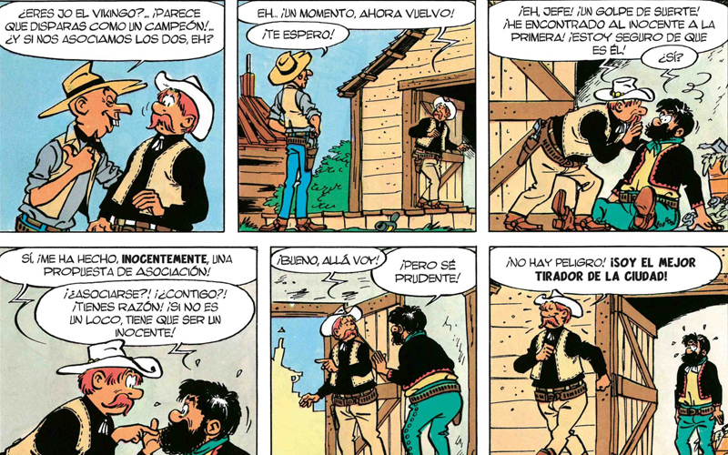 La primera aventura de este volumen llamada “El Inocente en la Ciudad” («L’innocent du village») nos sumerge en una trama intrigante en la que un inocente se encuentra atrapado en una ciudad dominada por bandidos. La ciudad es un lugar donde la ley no tiene cabida, y el delito campea a sus anchas. Es aquí donde comienza nuestra historia, y no podría haber un contexto más propicio para que Chick Bill y sus amigos intervengan. La figura del inocente que se convierte en el foco de atención de los bandidos añade una capa de vulnerabilidad a la trama. Los lectores simpatizan con este personaje que se encuentra en un ambiente hostil y peligroso. Pero la llegada de Chick Bill, Kid Ordinn y, por supuesto, Dog Bull, cambia las tornas. El Sheriff Dog Bull, aparece en esta historia de manera disfrazada, lo que agrega un elemento humorístico a la narrativa. La inclusión de Kid Ordinn adoptando una nueva identidad es un giro sorprendente. Su entusiasmo y su compromiso con el papel que asume como parte de su disfraz ofrecen momentos cómicos que equilibran la tensión de la trama principal. La interacción entre Chick Bill y Kid Ordinn, con este último inmerso en su papel, brinda oportunidades para el humor y la complicidad entre los personajes. En esta primera aventura, Tibet y Duchâteau construyen un mundo lleno de acción, intriga y emoción. La ciudad de bandidos es un escenario interesante y que cobra vida gracias al estilo artístico distintivo de Tibet. Casi todos los personajes secundarios que aparecen aumentan y mejoran la trama poco a poco. La combinación de personajes entrañables, unos malvados ladrones y una trama repleta de giros emocionantes, asegura que esta historia sea un comienzo impresionante para el volumen.