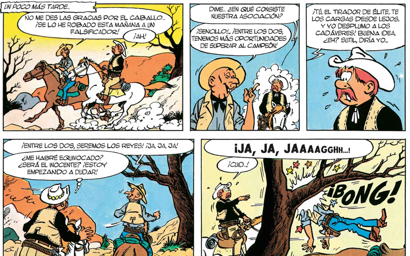 “El cowboy de hierro” («Le cow-boy de fer») nos adentra en una trama intrigante en la que un buhonero ha construido un autómata con la intención de vendérselo a un excéntrico y acaudalado coleccionista. Aquí, Tibet y Duchâteau juegan con la idea de las apariencias engañosas y la ambigüedad de los personajes. La introducción de un autómata como elemento central de la trama añade un toque de ciencia ficción al mundo del Salvaje Oeste, lo que crea un contraste divertido y fascinante. La historia explora el dilema moral de vender una creación artificial que parece tener vida propia, lo que plantea preguntas sobre la ética y la responsabilidad del buhonero. A medida que la historia se desarrolla, se vuelve cada vez más evidente que nada ni nadie es lo que aparenta ser. Los personajes se ven atrapados en una red de engaños y traiciones, lo que añade un elemento de suspenso y misterio a la narrativa. La trama se convierte en un juego de ajedrez en el que cada movimiento se estudia con atención. Esta tercera aventura destaca por su narrativa ingeniosa y sus giros sorprendentes. Tibet y Duchâteau demuestran su habilidad para mantener a los lectores en vilo mientras exploran temas profundos relacionados con la moralidad y la percepción de la realidad.