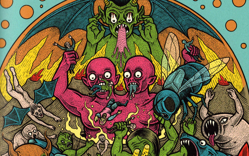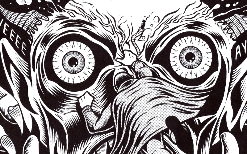 Ahora que hemos establecido el escenario detrás de esta obra, es hora de sumergirse en su corazón. Lo que hace que «Amanece en Ciudad Despojo» sea tan especial es su capacidad para mezclar elementos aparentemente inconexos en una narrativa coherente y adictiva. Desde el principio, se adentra en el terreno del tebeo underground e independiente. Estas historias cortas y fragmentos de irrealidad se deslizan por las páginas con una energía cruda y una falta de restricciones que es característica de este género. Rivière rompe las convenciones de la narrativa convencional y se entrega al caos creativo. Los cómics de terror de los años 50 de EC Comics son una influencia palpable en la obra de Rivière. Aquí, encontramos horrores que harían palidecer a los relatos más macabros de aquella época, pero llevados al extremo y alucinados. El humor negro se encuentra en abundancia en esta inquietante obra. La comedia retorcida y la sátira mordaz se entrelazan con las situaciones más grotescas y perturbadoras, creando un equilibrio que oscila entre la risa y el espanto. El espíritu del pulp y el cine de terror de serie B se infiltra en estas páginas. Hay una sensación de nostalgia por la era dorada del entretenimiento de terror, pero llevada a un extremo que raya en lo delirante. Cada una de ellas es un asalto a los sentidos, una experiencia que retuerce la mente y desafía la lógica.