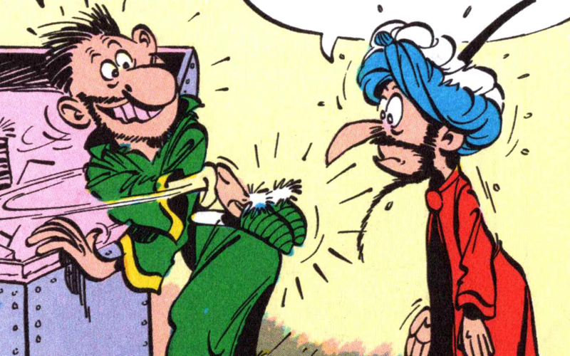 El guion ingenioso de Goscinny se manifestó a través de las tramas ligeras y con las situaciones más absurdas, en el afán de nuestro protagonista de alcanzar el poder. Desde malentendidos de deseos mágicos hasta estrategias políticas desastrosas, cada viñeta presentaba un nuevo giro cómico en la búsqueda del visir por su ambición desenfrenada. Creo lo personajes antes mencionados como clave para que la trama ganara enteros. Desde el gracioso y gordito califa que desempeña un papel crucial en las desventuras del visir, sirviendo como fuente constante de humor, hasta la dinámica entre visir y sirviente que se convirtió en un elemento central de la serie, añadiendo un punto superior en la comedia. La narrativa de «Iznogud» exploró temas universales como la corrupción, la codicia y las consecuencias de las ansias de poder. A través de la lente del humor y la sátira, Goscinny ofreció una crítica perspicaz de la sociedad y la política de la época. Hablando del estilo artístico de Tabary, este autor contribuyó significativamente a la apelación visual de la serie. Los diseños de personajes, con sus rasgos exagerados y expresiones vívidas, capturaron la esencia cómica de la trama. La sátira política y social fue una de las fortalezas clave de los guiones de en «Iznogud» durante muchos años. A través de las desventuras del visir, ofreció una crítica inteligente de la ambición desmesurada, la corrupción y las consecuencias cómicas de la búsqueda del poder. Cada intento fallido de Iznogud por alcanzar sus objetivos proporcionaba una ventana satírica a la naturaleza humana y a los dilemas de la sociedad. Los personajes cobraron vida bajo la pluma de Goscinny, y su habilidad para desarrollar personalidades complejas y memorables contribuyó en gran medida al éxito de la serie. Iznogud, con su codicia desbordante y su torpeza cómica, se convirtió en un protagonista icónico. Goscinny demostró una destreza notable al equilibrar el humor físico con los diálogos ingeniosos marca de la casa, creando una narrativa que era tanto visualmente impactante como intelectualmente estimulante.