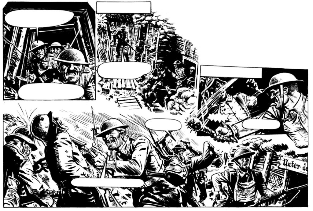Todo esto subyace en estos capítulos de apenas cuatro páginas, que entrega tras entrega, cautivo a muchos lectores durante más de un lustro en las islas británicas. Magníficos ejercicios de síntesis dramática donde Mills capturaba la atención del lector con maestría y el magnífico dibujo de Joe Colquhoum hacia el resto para retratar con altas dosis de un realismo hasta entonces no visto en UK. Cabe destacar que, en alguna ocasión, le pidieron desde la editorial a Colquhoum que no fuera tan realista en sus viñetas, obligándole a retocarlas para “suavizarlas”. Aún con eso, cada una de estas páginas es una ventana al horror que supuso la Primera Guerra Mundial. Una ventana que no está situada en los puestos de mando, sino en la trinchera, donde la vida se juega y se pierde. Donde no hay héroes, solo pobres infelices que no son más que carne de cañón.