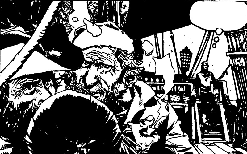 El estilo de dibujo de Enrique Breccia es una amalgama única de diversas técnicas que resulta en una expresividad visual sin igual. Su manejo del pincel es particularmente destacado, y esto se refleja en la forma en que las líneas fluidas y enérgicas dan vida a cada elemento de sus ilustraciones. Desde los personajes hasta los escenarios cósmicos, cada trazo parece llevar consigo una carga de emoción y movimiento. La técnica de este autor argentino a menudo se caracteriza por la combinación de líneas fuertes y orgánicas con manchas de tinta, creando una sensación de textura y profundidad. Este enfoque dinámico aporta vida y energía a las páginas, convirtiendo cada viñeta en una obra de arte por derecho propio. Imprime una caracterización única a sus personajes a través de su estilo de dibujo. Los rostros de los protagonistas y de los seres alienígenas no son solo representaciones visuales; son ventanas a las emociones y experiencias de cada entidad en la narrativa. Los rasgos faciales son a menudo exagerados, utilizando líneas gruesas y contornos pronunciados para resaltar expresiones y gestos. Los ojos, en particular, son elementos expresivos que parecen comunicar profundidades emocionales sin necesidad de palabras. En «El Peregrino de las Estrellas», los personajes se comunican no solo a través de diálogos, sino también a través de la intensidad de sus miradas y las expresiones plasmadas en sus rostros. Toda esa capacidad de detalle plasmada en cada viñeta aumenta la profundidad de la obra y, lejos de dificultad la narrativa que despliega, la potencia de forma exponencial.