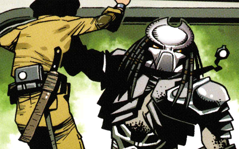 Este tebeo se basa en una premisa simple pero efectiva: los depredadores son cazadores, y todos los demás, presas. Los humanos pueden ganar, pero siempre después de una lucha desesperada contra probabilidades difíciles. Y los humanos no salen en busca de estos alienígenas. Las primeras páginas dan un giro completo a esa idea, ya que conocemos al personaje principal, Theta. Ed Brisson y Kev Walker nos la presentan con una introducción violenta y enérgica. También sorprendente, porque durante las primeras tres páginas de este tebeo creemos que estamos viendo una lucha a muerte entre Predators. Con ese punto de arranque ya queda atrapado el lector, despertado el interés sobre el personaje cazador de monstruos.