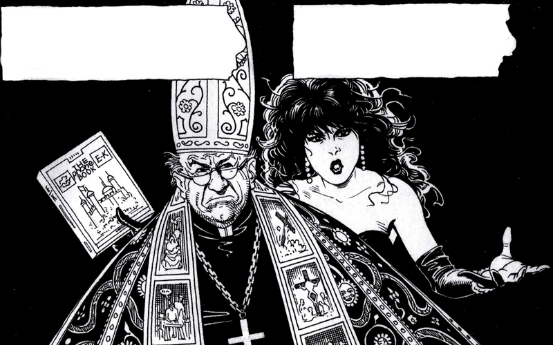 Bolland no solo es un gran dibujante, sino que también es un narrador visual de primera. Sabe cómo estructurar una página para que la historia fluya de manera natural. Sus composiciones son dinámicas y llenas de energía, y sabe exactamente dónde colocar cada viñeta para maximizar el impacto. Un buen ejemplo de esto es «La Actriz y el Obispo«. Aunque las historias son cortas, y a menudo absurdas, las presenta de una manera que te mantiene enganchado. Cada viñeta es una pequeña obra de arte, formando todas juntas una narrativa tan coherente como atractiva. Es un maestro en guiar la mirada del lector, en asegurarse de que cada detalle se vea y se aprecie.