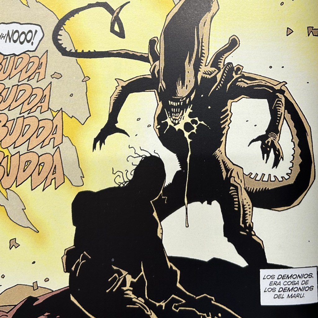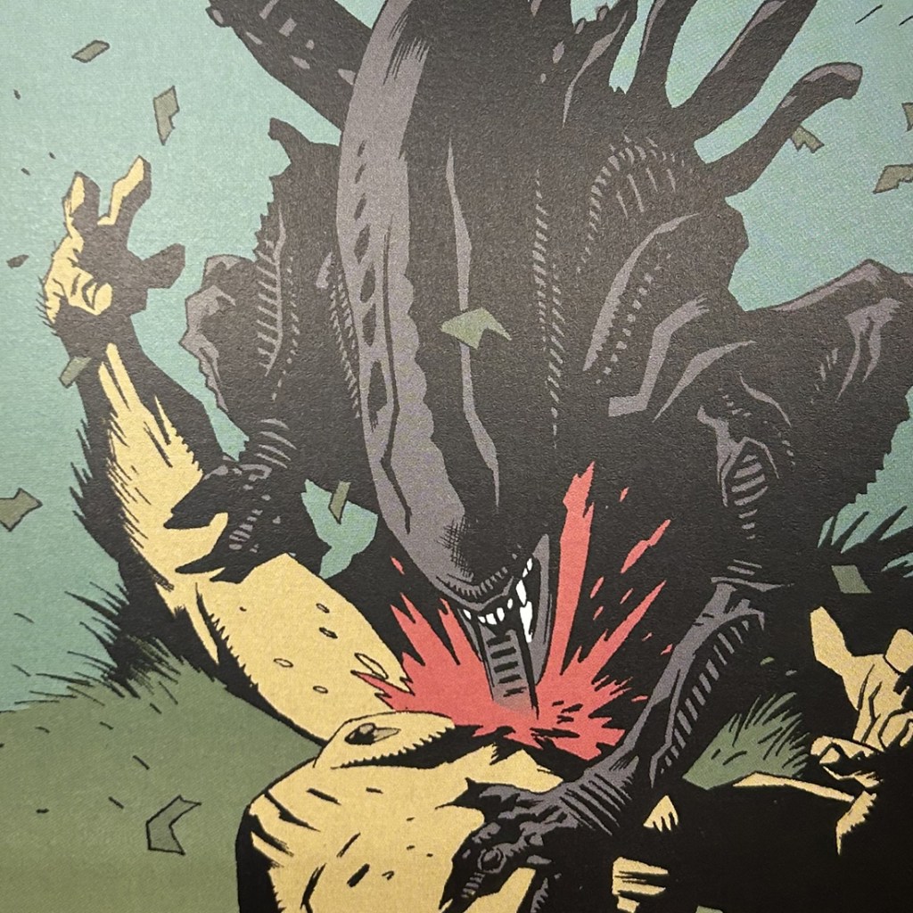 Y el último, pero no por menos llamativo, mencionamos «Aliens: Salvation» de Dave Gibbons, Mike Mignola y Kevin Nowlan junto con Matt Hollingsworth. Esta historia corta es una exploración del miedo y la fe. El protagonista, Selkirk, es un hombre que se encuentra varado en un planeta desconocido, con un grupo de personas que quieren terraformarlo para llevar humanos allí, pero no todos las ubicaciones los la ideoneas para esa misión. Según avanzamos en las páginas, la narrativa es sombría, con un tono casi religioso. Selkirk comienza a cuestionar su fe y su humanidad mientras lucha por sobrevivir. El arte de Mignola es, como siempre, impresionante. Su estilo oscuro y angular encaja perfectamente con el tono de la historia. La trama es tensa y se siente como una meditación sobre la supervivencia y la redención. Es una historia que te deja pensando mucho después de que hayas terminado de leerla.