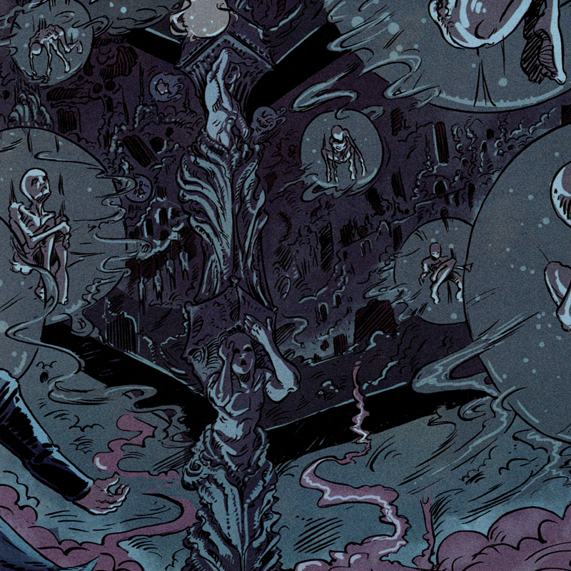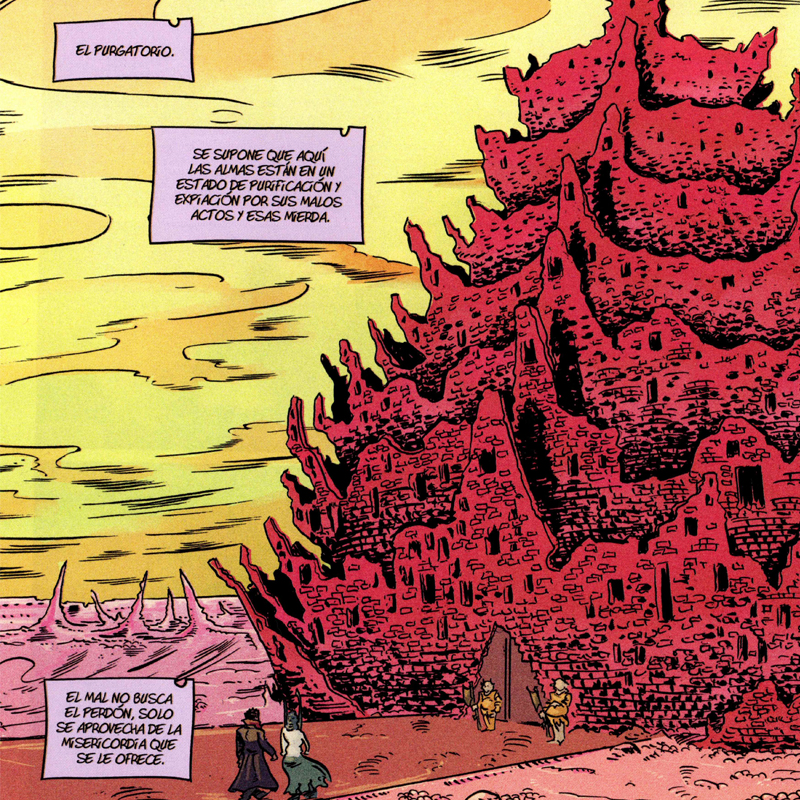 Braña y Pérez Mesa juegan entre dos mundos, creando un viaje y un juego a la vez. La ambición contextual que presentan es notable, haciendo que la acción se solape con la explicación, pero manteniendo siempre una historia muy entretenida. Es como estar en una montaña rusa, levantando los brazos y gritando sin preocuparse por el destino. Todo parece acercarse al mundo del superhéroe arcano y místico sin que se note demasiado. Su personaje y el mundo en el que vive recuerdan a los universos de personajes conocidos de editoriales como Marvel o DC Comics. Aunque no es como ninguno de ellos, hay momentos en los que el parecido es innegable. Nuestro personaje conocido como Gary Bowman está en una situación complicada y necesita devolver el orden y la cordura a un lugar tan extravagante e irracional como es el más allá. Por eso no se puede desvelar mucho más de la trama para que disfrutéis de este maravilloso paseo por el purgatorio.