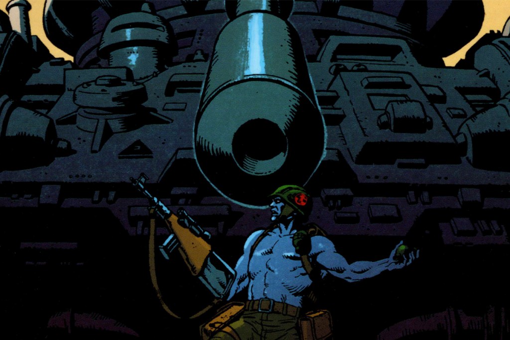 Para empezar, hablemos de Nu, ese planeta donde el cielo está lleno de gases venenosos y el suelo es un campo minado perpetuo. Si la vida en la Tierra te parece un asco, espera a que pongas un pie en este paraíso tóxico. La guerra química ha dejado a Nu en un estado constante de «vamos a morir todos«. Los Norteños y los Sureños, dos facciones que claramente no tienen nada mejor que hacer, están atrapados en una lucha sin fin por el control de este basurero espacial. En medio de este caos surge nuestro héroe, Rogue Trooper, un soldado genéticamente modificado, un IG (Infantería Genética) que es básicamente el Superman de los soldados, pero sin la capa y con más balas. No está solo; lleva consigo las bio-chips de sus compañeros caídos: Gunnar (en su rifle), Helm (en su casco) y Bagman (en su mochila). ¡Sí, has oído bien! Lleva a sus amigos muertos pegados a sus herramientas. Nada como la «amistad» de estar literalmente integrado en el equipo de tu colega.