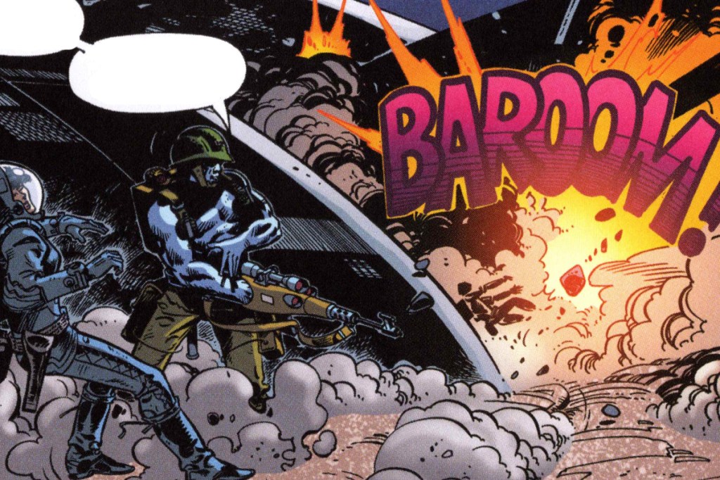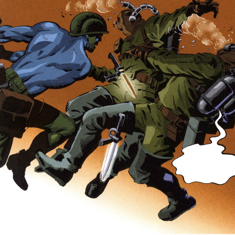 Para entender completamente la magia de Rogue Trooper es esencial profundizar en sus compañeros, los inseparables bio-chips. Gunnar, Helm y Bagman no son solo herramientas; son personajes por derecho propio con personalidades distintivas. Gunnar es el rifle, un francotirador implacable con un humor seco que no puede faltar en ninguna conversación. Helm, el casco, es el cerebro táctico, siempre calculador y un poco paranoico, asegurándose de que Rogue tenga las mejores posibilidades de sobrevivir. Bagman, la mochila, es el más pragmático, siempre preocupado por el suministro y mantenimiento del equipo, pero con una lealtad inquebrantable a Rogue. La tecnología en Rogue Trooper es un sueño húmedo para cualquier amante de la ciencia ficción militar. Desde rifles que pueden pensar hasta cascos con inteligencia artificial, el equipo de Rogue no es solo avanzado; es ridículamente genial. Gunnar, el rifle que habla, es tanto un arma letal como un compañero sarcástico. Helm, el casco, ofrece una protección y táctica estratégica que haría sonrojar a cualquier general. Y Bagman, la mochila, es básicamente una navaja suiza de alta tecnología y actitud propia.