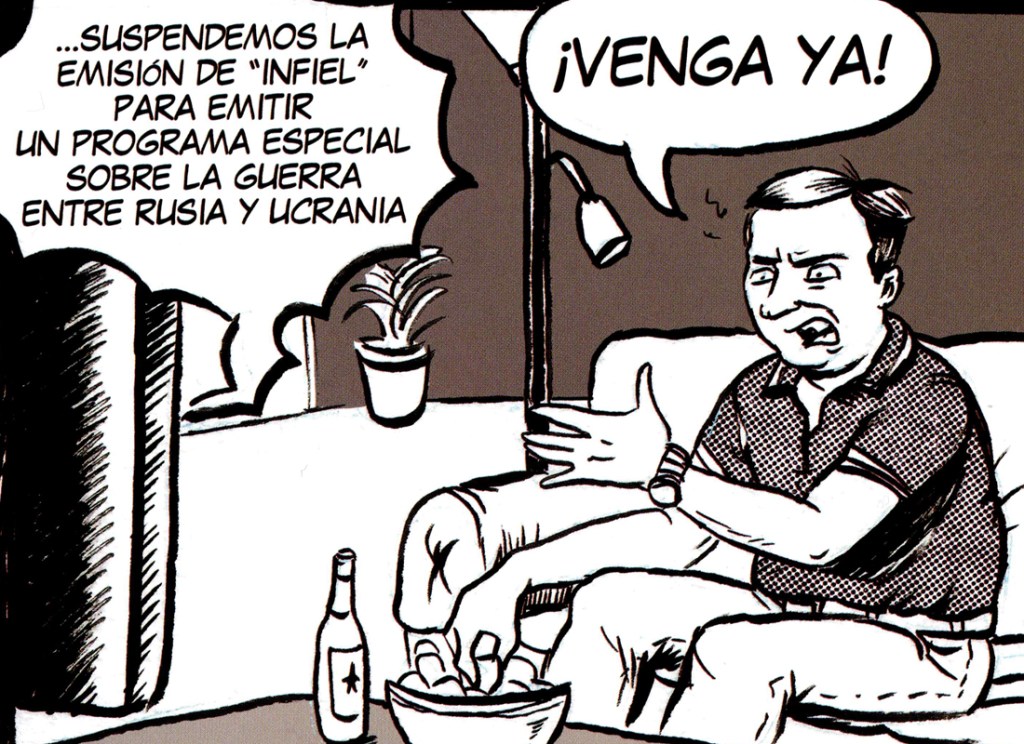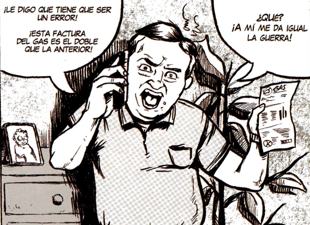 El contexto de la invasión rusa a Ucrania sirve como un telón de fondo omnipresente en » PAZ | МИР», pero la obra trasciende esa cuestión específica para abarcar conflictos en otras partes del mundo, como la situación en Gaza o las guerras olvidadas que persisten en diferentes regiones. Esta amplitud temática subraya la universalidad del mensaje de la obra: la guerra y la búsqueda de la paz son realidades que afectan a todos, sin importar la geografía o el contexto cultural. Entre todos estos relatos me gustaría destacar uno en concreto: el realizado por Claudio Cerdán y Raquel Díez con un titulo de lo más sarcástico llamado “Todo Bien”, donde en pocas viñetas se recorren muchas situaciones que todo el mundo pudo vivir en Europa.