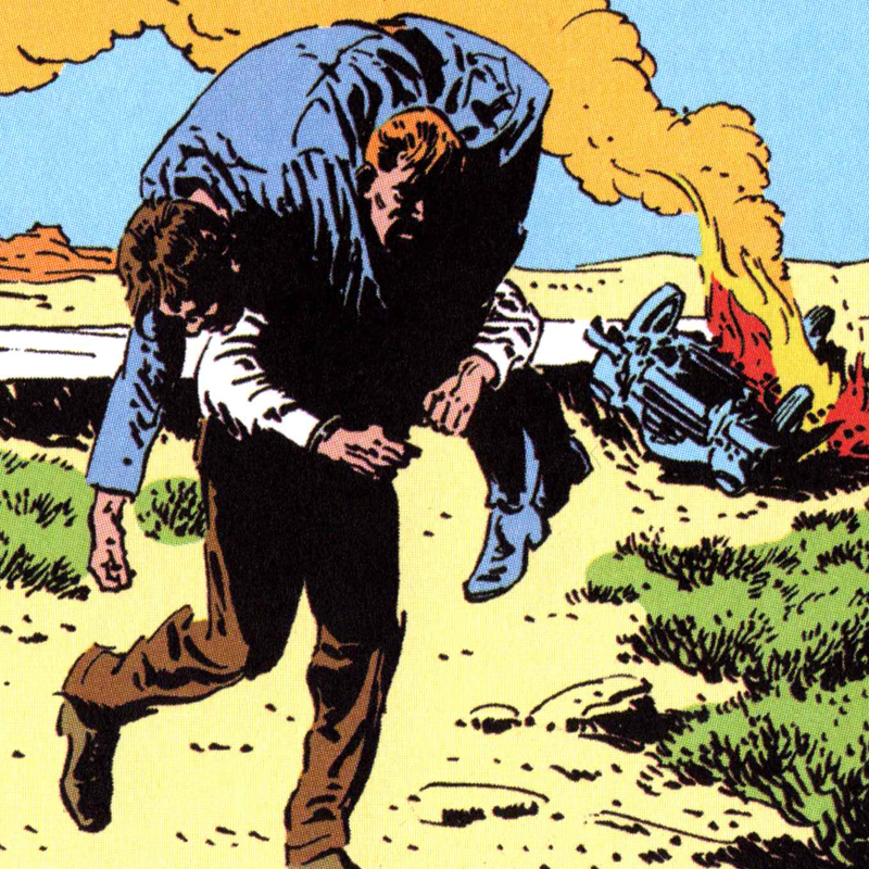 La siguiente que destacaría es Carroña”(“Carrion Death”), una de esas historias que combina horror y con una especie de justicia divinal. La trama sigue a un ladrón que es perseguido por la policía y acaban en el desierto. Como buen ladrón, se apropia de lo ajeno, siendo en este caso la máxima llevada al extremo y acabando con la vida del policía. Así este guion explora la brutalidad del ser humano y la degradación de la humanidad en circunstancias extremas. Todo bajo el enfoque visceral y perturbador de Reed Crandall y Al Feldstein.
