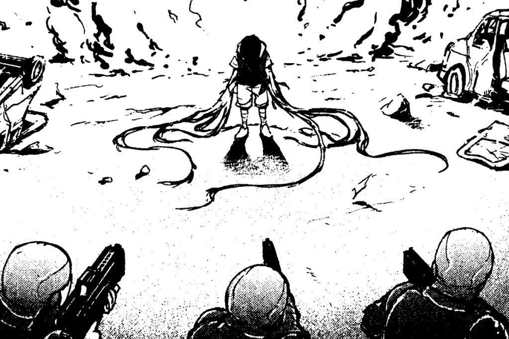 El guion en esta ocasión se centra en la intensa persecución que sufre Eigth, un niño con habilidades muy superiores a lo que se espera de él, y su compañero Renji. Ambos han escapado de la emboscada en la ciudad, y ahora son buscados implacablemente por las fuerzas del gobierno. Estas fuerzas no están limitadas a los agentes humanos; la corporación secreta gubernamental ha optado por enviar a otros Adous, seres igualmente poderosos, para capturar y llevarlos de vuelta a las instalaciones secretas donde realizaban experimentos con ellos. Esta persecución que nos ofrece Jaku tiene múltiples capas de significado. En la superficie, es un juego del gato y el ratón, donde Eigth y Renji deben usar todas sus habilidades para mantenerse un paso adelante de sus perseguidores. Más profundamente, es una lucha por la supervivencia y la libertad. Cada vez que los dos chicos se enfrentan a otro Adou enviado por el gobierno, se revela más sobre el sistema opresivo que los quiere bajo su control. El gobierno no ve a estos seres como individuos, sino como herramientas, y esto queda patente en la fría y calculada manera en que envían a sus propios «productos» para capturar a los fugitivos.