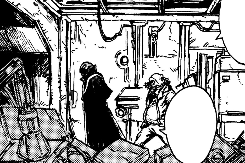 Por otro lado, los protagonistas y antagonistas son representados de manera única a través del uso de líneas claras y expresivas, que comunican tanto su estado físico como emocional. La protagonista femenina, por ejemplo, es dibujada con una elegancia que contrasta con la dureza del mundo que la rodea, lo que sugiere una especie de resistencia en su carácter. Kent juega con las proporciones del cuerpo, acentuando rasgos como los ojos, las manos y la postura para comunicar el carácter de cada individuo, desde la vulnerabilidad hasta la fuerza contenida. Además, los trajes y vestimentas de los personajes están intrincadamente detallados. En este mundo postapocalíptico, la ropa no solo tiene un propósito funcional, sino que también actúa como una extensión de la personalidad de los personajes. Los diseños son variados y cargados de textura, con materiales desgastados que reflejan la dureza de la vida en este mundo. El uso de sombras profundas en la indumentaria da una sensación de deterioro, lo que enfatiza la longevidad de la lucha por la supervivencia. Los detalles minuciosos que Kent inyecta en los fondos y entornos del manga, como las ruinas de ciudades que alguna vez fueron prósperas o los cielos perpetuamente apagados, refuerzan la naturaleza opresiva de este mundo.