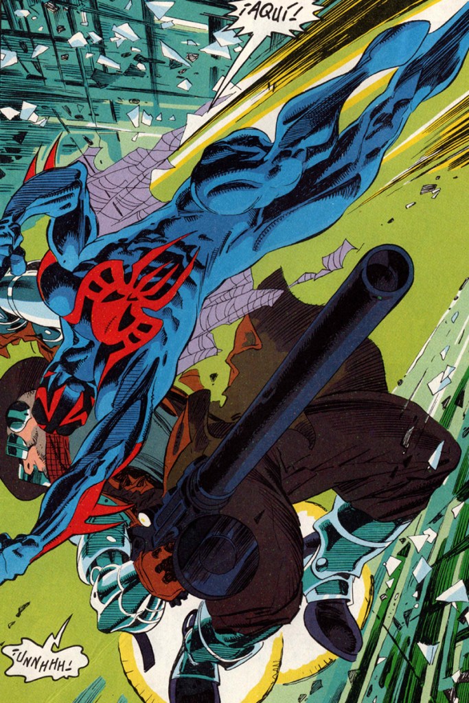 El uso de formas más angulares y una máscara completa sin expresiones le dio a Spiderman 2099 una sensación de dureza y misterio, elementos que encajaban a la perfección con la atmósfera distópica del cómic. Leonardi es un maestro en capturar la fluidez del movimiento, y su habilidad para dibujar la agilidad y las poses acrobáticas de Miguel fue esencial para destacar al personaje como dinámico y letal. Las secuencias de acción en los primeros números de la serie son rápidas y llenas de energía, con viñetas que casi parecen moverse de un lado a otro de la página. Esta capacidad para infundir un sentido de velocidad y poder en las escenas de combate ayudó a definir a Miguel como un héroe ágil pero también más brutal y directo en comparación con su predecesor, Peter Parker.