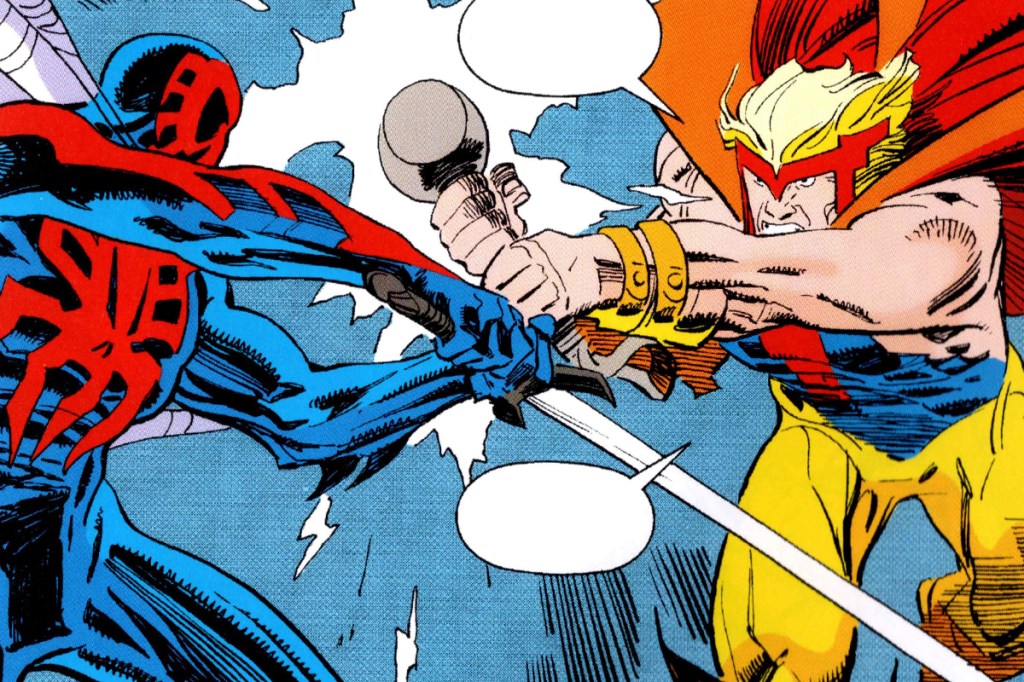 El segundo ómnibus de Spiderman 2099, bajo la pluma y el arte de autores de renombre como Tony Skinner, Grant Miehm, Pat Mills, Ron Lim, Pat Broderick, John Francis Moore, Jim Fern, Chris Batista, Peter David, y Rick Leonardi, contiene, además de la serie que recopila, varias cabeceras en su haber: a los Spider-Man 2099 #15 al #25 le acompañan Ravage 2099 #15, X-Men 2099 #5, Doom 2099 #14, y The Punisher 2099 #13, presenta un cruce épico que une varias de las principales series del «Marvel 2099«: «La caída del Martillo«. Este arco argumental se convierte en un punto de inflexión para el futuro distópico de Marvel, explorando la resurrección de viejos superhéroes y, en particular, el regreso de Thor y los dioses asgardianos. El enfoque central recae en cómo la reaparición de estas figuras míticas altera radicalmente el panorama de un mundo que ya vive al borde del caos, tanto política como socialmente.