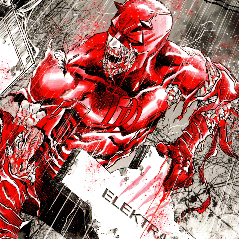 La primera historia llamada “Invicto” (“Undefeated”), escrita por Garth Ennis e ilustrada por Rachael Stott se centra en Daredevil, ahora transformado en un zombi y reducido a una bestia que pelea en un ring para entretenimiento público. La historia nos presenta un contexto brutal en el que héroes y villanos zombis son utilizados como gladiadores en una distopía donde la esperanza ha sido sustituida por el morbo y la violencia. El hombre sin miedo, que alguna vez fue el protector de la cocina del infierno, ha perdido todo, y su existencia se ha reducido a luchar para satisfacer los deseos macabros de una audiencia insensible. Ennis aprovecha esta trama para explorar la degradación de un héroe tan noble, quien, a pesar de estar atrapado en un cuerpo consumido por la infección, parece seguir luchando contra sus instintos. Esta historia plantea una dolorosa ironía cuando un personaje conocido aparece en el ring para darle a Matt Murdock una salida definitiva a su miseria, cerrando un capítulo de tragedia entre dos enemigos con un momento de reconciliación inesperada. En este enfrentamiento final, Ennis ofrece una conclusión sombría, a la vez que llena de simbolismo sobre la pérdida de la humanidad y el destino inevitable que acompaña a este apocalipsis. Rachael Stott da vida a este enfrentamiento con un estilo visual preciso y detallado. Su arte se centra en los contrastes del blanco y negro, con estallidos de rojo que resaltan la brutalidad del combate y la decadencia de los cuerpos zombificados. Los detalles en cada línea, desde las expresiones desfiguradas hasta la anatomía expuesta, transmiten tanto la degradación física como el último vestigio de dignidad de Daredevil en su lucha final.