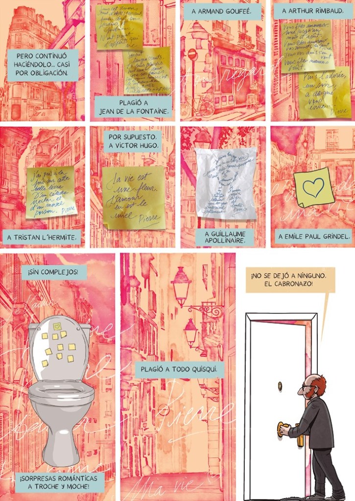Si la historia ya es apabullante, las ilustraciones de Lorenzo Caudevilla son la guinda del pastel. Su trazo combina realismo con un toque caricaturesco que encaja perfectamente con el tono de la obra. Pero lo que realmente destaca es cómo llena las páginas de referencias y homenajes a grandes artistas del cómic y la literatura. Desde guiños a Charles Schulz (creador de Snoopy) hasta cameos de escritores clásicos como García Márquez, cada página es un festín visual para los amantes del arte. Caudevilla juega con los estilos y las paletas de colores, adaptándolos al tono de cada escena: grises sobrios para los momentos más tensos y colores vibrantes para los episodios más optimistas. Este juego con los estilos gráficos no solo es un placer estético, sino que también subraya las emociones y los temas de la historia. Cada viñeta está diseñada con una atención al detalle que demuestra el amor y la pasión que Caudevilla ha plasmado con su trazo