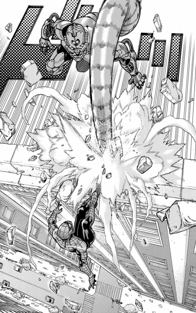 Otro de los puntos fuertes del manga es el vacío dejado por Peter Parker. El creador japonés usa a nuestro adolescente para intentar llenar los zapatos de un héroe que parece inalcanzable, tanto literal como figurativamente. Este enfoque no solo refleja la lucha de Yu, sino que también nos recuerda que Spider-Man no es solo un individuo, sino un símbolo de esperanza y sacrificio. Además según avanzamos en las páginas veremos dos relatos en paralelo de Yu y de Peter. La aparición de villanos y desafíos más grandes de lo que Yu puede manejar añade tensión y urgencia a la trama, subrayando el hecho de que no basta con llevar el traje para ser digno de él. Sin embargo, es precisamente esta lucha desigual lo que hace que la historia sea tan entrañable. Al igual que Peter, Yu descubre que el heroísmo no se define por las victorias, sino por la voluntad de seguir adelante, incluso cuando parece imposible.