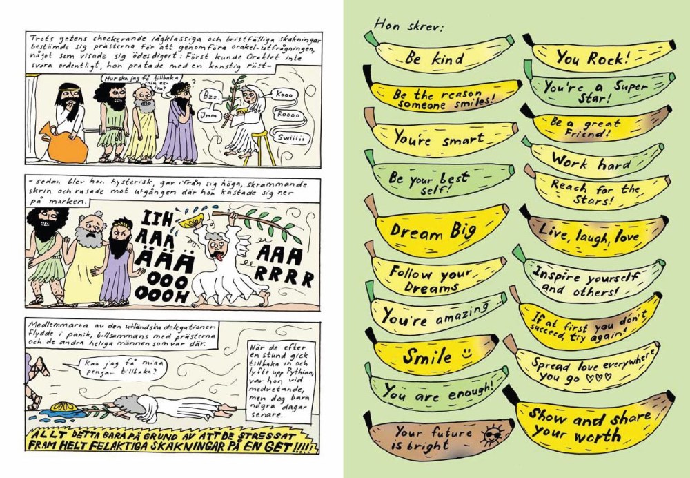 Esta es la materia prima de “La voz del oráculo” (“Pythian pratar”) de Liv Strömquist, recién editado en castellano por Reservoir Books. Un cómic donde la autora analiza esa búsqueda individual que se da en sociedad actual para encontrar bienestar, felicidad o un mayor desarrollo personal. Una búsqueda en la que la lógica de mercado y la necesidad de consejo confluyen y se sintetizan, en ocasiones, en frases de motivación. Otras veces en meras prescripciones de un producto o servicio.