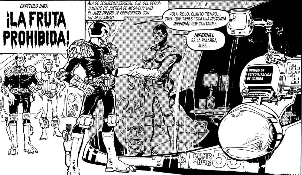 Ese virus asesino convierte a los ciudadanos en bestias rabiosas antes de mandarlos a criar malvas. Solo una cosa puede salvarlos: una vacuna que se encuentra en Mega-City Uno. ¿La solución? Mandar al tipo más duro, inflexible y armado hasta los dientes que existe: el Juez Dredd. ¿El problema? Entre él y su destino hay una franja de tierra devastada por la guerra nuclear. Un páramo infernal donde los McDonalds y los Burger Kings han pasado de las hamburguesas a la guerra, las ratas pueden acabar en un abrir y cerrar de ojos con cualquiera, y la aparición de tiranosaurios siempre es un punto a favor de cualquier tebeo. Dredd no va solo, claro. Se lleva a un grupo de compañeros, incluyendo a Spikes Harvey Rotten, un punk macarra con más chulería que neuronas, y un par de jueces que ayudan en lo que pueden porque, seamos sinceros, nadie más que Dredd está diseñado para sobrevivir a semejante viaje.