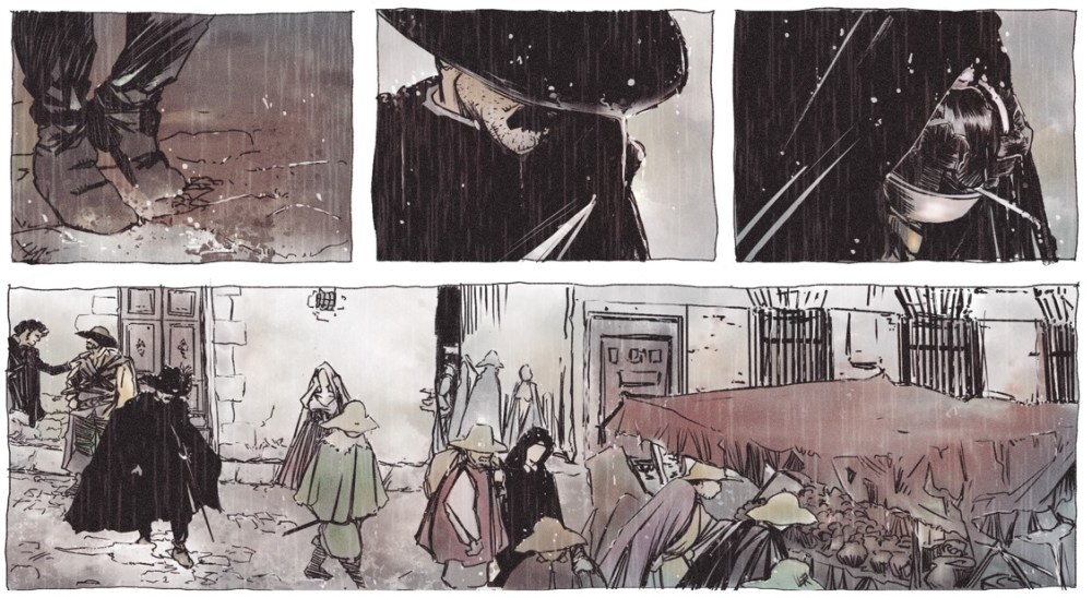 Junto a Contreras nos encontramos al “Fénix de las letras”: Lope de Vega. Él será quien acogerá al militar en su casa durante los ocho meses que (ficticiamente) pase en ese Madrid del siglo XV que ha plasmado con tanto acierto Jorge Esteban Urabayen. Así las armas y las letras se encuentran. Hermanándose en paseos y conversaciones de taberna, evocando recuerdos de batallas y entuertos, amores y desengaños, con victorias y derrotas, mientras el vino se bebe y el ambiente se embriaga. Todo con un cariz humano, pegado a lo posible. Sin mitos ni poses, con textos que acertadamente evocan a ese tiempo, aun siendo escritos para que su comprensión sea inmediata. Ahí radica uno de los trucos del tebeo: manejar con soltura los resortes del lenguaje actual, pero dejando un sabor “a época” cada vez que suenan una de las voces de los personajes.