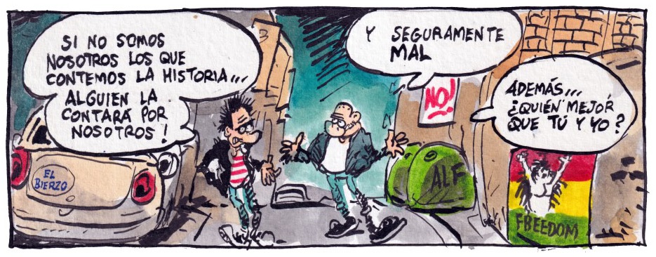 Del mismo modo, en las páginas de “El Jueves”, desde 1984 “Pedro Pico y Pico Vena” aparecían semanalmente para contar sus historias. Bañadas de Punk pero también de un cierto costumbrismo de barrio. Ese en el que la barra de bar y los movimientos vecinales tienen la misma importancia. Pues por entonces no había más red social que la calle, con los parques y bares como lugares de reunión. En vivo. Así se conocían bandas nuevas, se pasaban cintas con material para escuchar, se asistía a conciertos mientras los fanzines alimentaban toda la cultura surgida alrededor de un “hazlo tu mismo” autóctono. En ocasiones directo, pero cargado de la frescura de lo no dirigido. De letras a veces irónicas, otras descriptivas de una realidad que muchos negaban pero que estaba ahí. Una realidad que, por citar un ejemplo, Evaristo Páramos, de La Polla Records, se encargó de retratar con una mordaz y certera lucidez que sigue siendo válida a día de hoy. Que mete el dedo en la llaga con descaro y audacia.