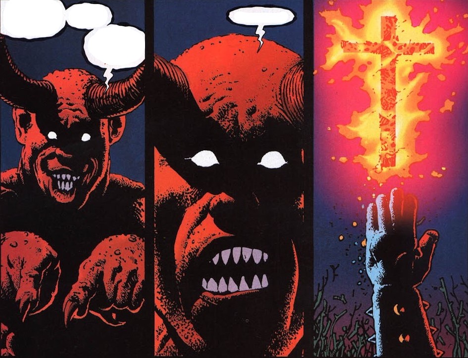 En este tomo también cabe destacar la participación de Richard Corben junto con José Villarrubia. Corben no solo dibujó al héroe de cabeza llameante: lo hizo suyo. Su trazo grotesco y detallado encajó a la perfección con la maldición de Johnny Blaze, dándole un aspecto más demoníaco que nunca. La calavera llameante del protagonista no es solo un cráneo ardiente; es una presencia infernal que parece derretirse en cada viñeta. Las sombras profundas y las texturas marcadas aportan un realismo grotesco que potencia la sensación de pesadilla. Además, el uso de la iluminación en su arte refuerza el tono infernal de la historia. Los contrastes exagerados y los colores saturados dotan a cada página de una energía visceral.