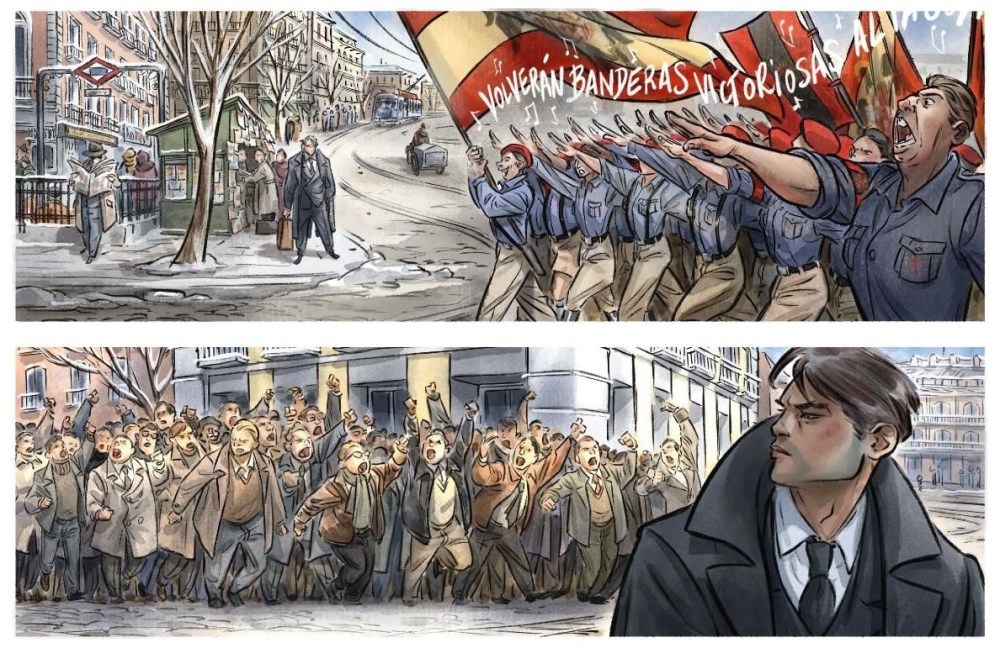 Todo eso está en “Contrapaso. Los hijos de los otros”. Un tebeo que, lejos de dicotomías maniqueas discurre en una acertada escala de grises. Sirvan de ejemplo los protagonistas de la obra, de ideología contraria: un veterano falangista descreído y un joven de izquierdas criado por un militar del régimen. A pesar del evidente conflicto generacional que hay entre ellos, además del político, forjaran una relación que tiene mucho de las “buddy movies” clásicas, pero que sirve además para mostrar lo compleja que era esa sociedad silenciada por la propaganda oficial de la época. Teresa Valero traslada eso al tebeo de forma notable, haciendo de este modo una obra con más cuerpo, más pegada a lo real. Más creíble, en definitiva.