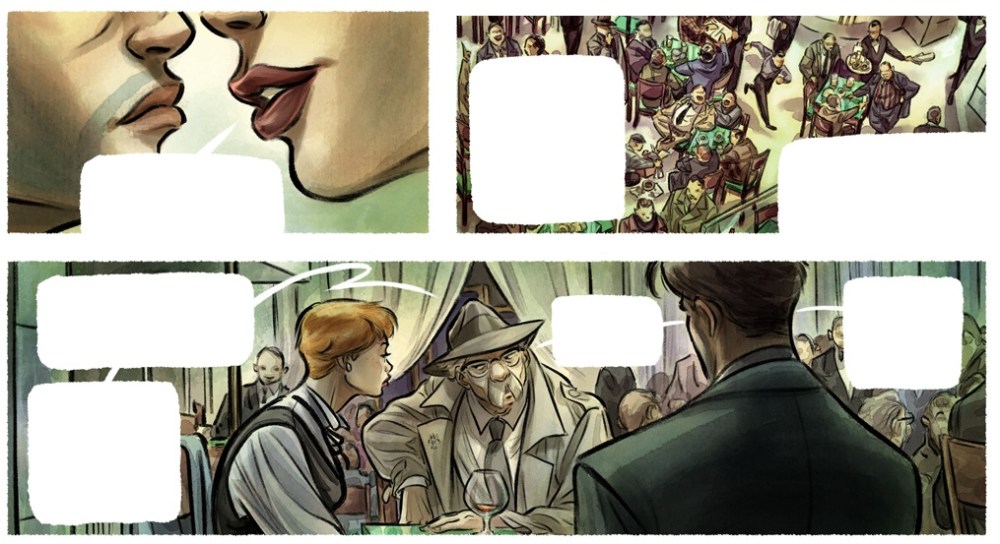 Secuenciada de forma magistral, en las páginas de “Contrapaso”, el relato cobra vida y revela una narración gráfica precisa. Con unos colores humanos que retratan ese Madrid gris mientras se resuelve el misterio. En las viñetas, cada gesto y encuadre enfatiza lo contado, metiendo de lleno en la trama. Una trama que consigue llevarnos a otra época. Donde no hay ni detalle ni puntada sin hilo. Como “El Huerfanito” la canción de Antonio Machín, que aparece en varias páginas, éxito popular de la época que se presta a varios niveles de lectura cuando “suena” en el cómic.