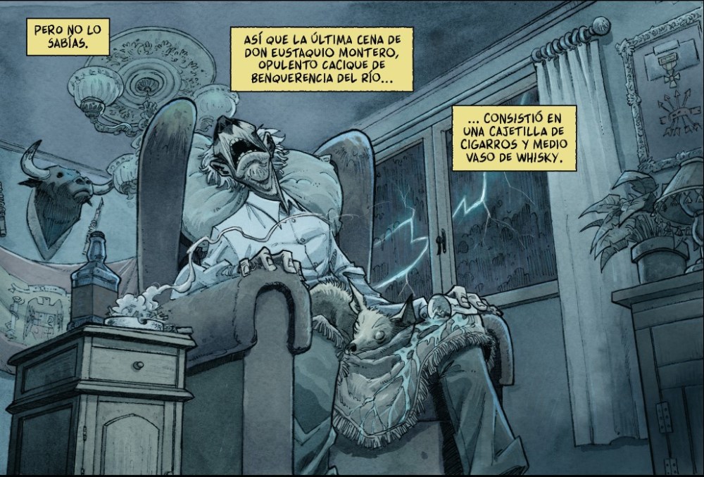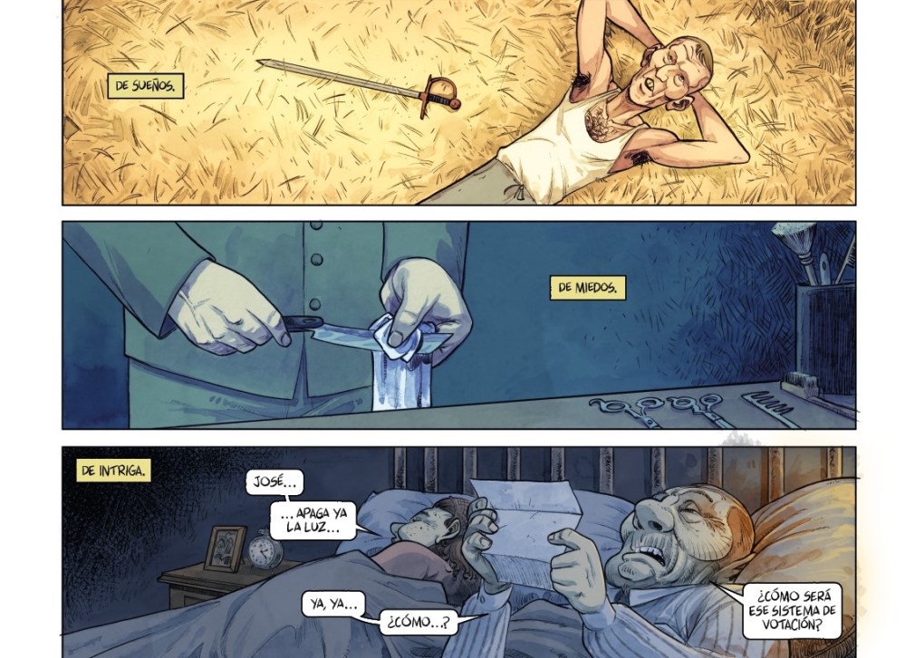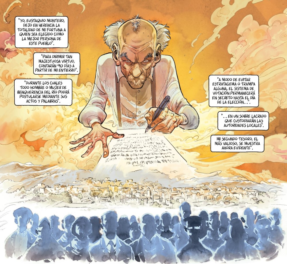 El apartado gráfico merece un párrafo entero. O dos. O una tesis. Porque Isaac no solo escribe, dibuja con la misma visceralidad con la que se escribe un poema triste. Cada viñeta está cargada de intención. Los colores, apagados, terrosos, como sacados de una vieja fotografía, te sumergen en una atmósfera de opresión y tensión continua. Las expresiones faciales son un espectáculo en sí mismo: miradas que suplican, sonrisas que esconden puñales, cejas que se alzan como cuchillos. El dibujo, como la historia, es un espejo oscuro en el que se refleja la sociedad… y nosotros con ella. Que nadie se lleve a engaño. Aunque este comic sea duro, también tiene humor. Un humor negro, ácido, a veces incómodo, que se cuela entre las grietas de la tragedia como una carcajada amarga. Ese humor que se ríe de lo solemne, que desnuda las pretensiones de los personajes. Isaac Sánchez tiene ese don extraño de hacerte reír justo cuando estás a punto de llorar. O al revés. Y sí, hay momentos para la emoción pura. Porque en medio de tanta apariencia, de tanta impostura, también deja espacio para la ternura verdadera. Para esa bondad pequeña, silenciosa, que no busca premios ni aplausos. Esa que a veces se da en forma de gesto, de palabra, de silencio. Esa que en los tebeos de Isaac Sánchez no hace ruido, pero cambia vidas.