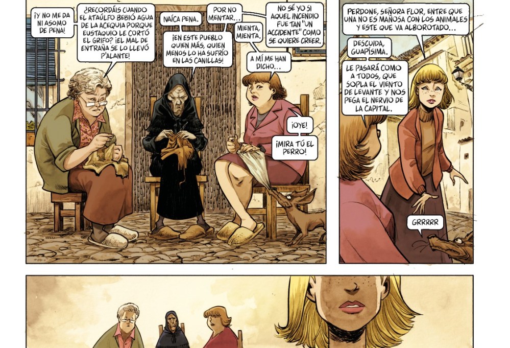 Lo que hace que esta obra destaque es que Sánchez no cae en la trampa de la caricatura vacía. Cada personaje, por grotesco que parezca, está construido con mimo. No hay buenos puros ni malos sin fisuras. Hay seres humanos llenos de contradicciones, de heridas, de traumas que se arrastran como sombras por las callejuelas empedradas del pueblo. El autor nos obliga a mirar de frente a esas partes de nosotros que preferimos esconder. Esa necesidad de gustar, de ser aplaudidos, de que hablen bien de nosotros, aunque por dentro estemos llenos de rencor, envidia o miedo. Y es que este tebeo es también un retrato preciso y precioso, aunque duela, de la España negra. Esa España profunda que nunca se fue del todo. Esa que aún cree que aparentar importa más que ser. Que prefiere callar lo feo para que nadie diga que en su casa hay polvo. Con todos estos hilos Sánchez teje esos tapices con líneas gruesas y firmes, pero también con silencios, con miradas esquivas, con cielos cargados de nubes donde el sol no brilla, aunque todos aseguren que hace un día precioso.