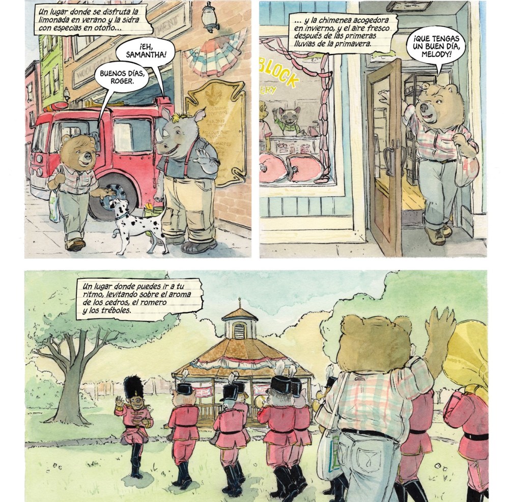 Lo fascinante de esta historia es su tono. Horvath juega con los extremos de forma magistral. Por un lado, tienes escenas que parecen sacadas de un libro de cuentos ilustrado: Niños en la escuela, una pequeña banda de música tocando el parque o mapaches paseando en triciclo. Pero por otro, hay mutilaciones, torturas psicológicas y una tensión que no deja respirar. Cada página está impregnada de un contraste delicioso entre lo adorable y lo abominable. Como cuando ves a Samantha limpiar sus herramientas de tortura mientras vuelve a la tienda andado para atender a sus clientes. O cuando sonríe mientras idea cómo despistar al sheriff con la misma delicadeza con la que arregla una lámpara de aceite. Este cómic no es simplemente violento. Es inteligentemente cruel. Juega contigo. Te hace reír para luego golpearte con una escena de horror puro. Te hace confiar en un personaje para luego arrancártelo de las manos. Y ahí estamos nosotros atrapados. Hipnotizados.