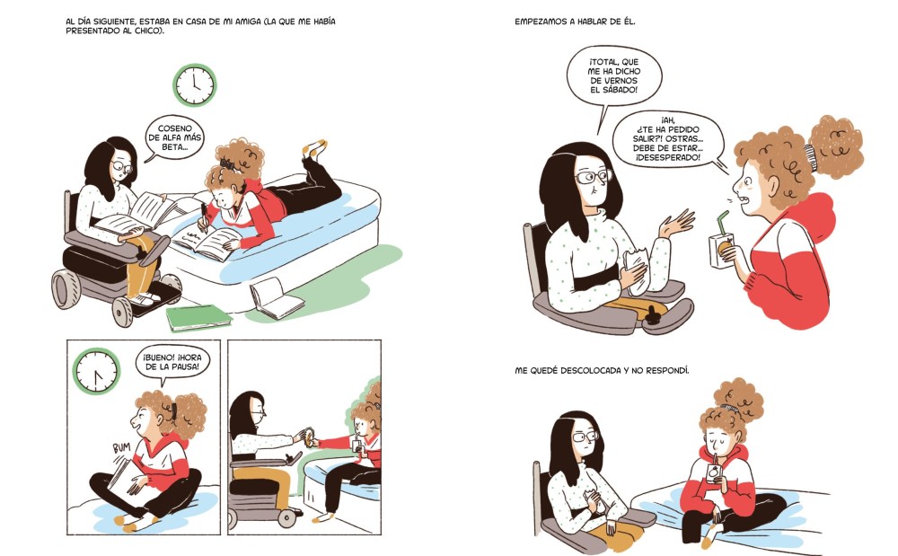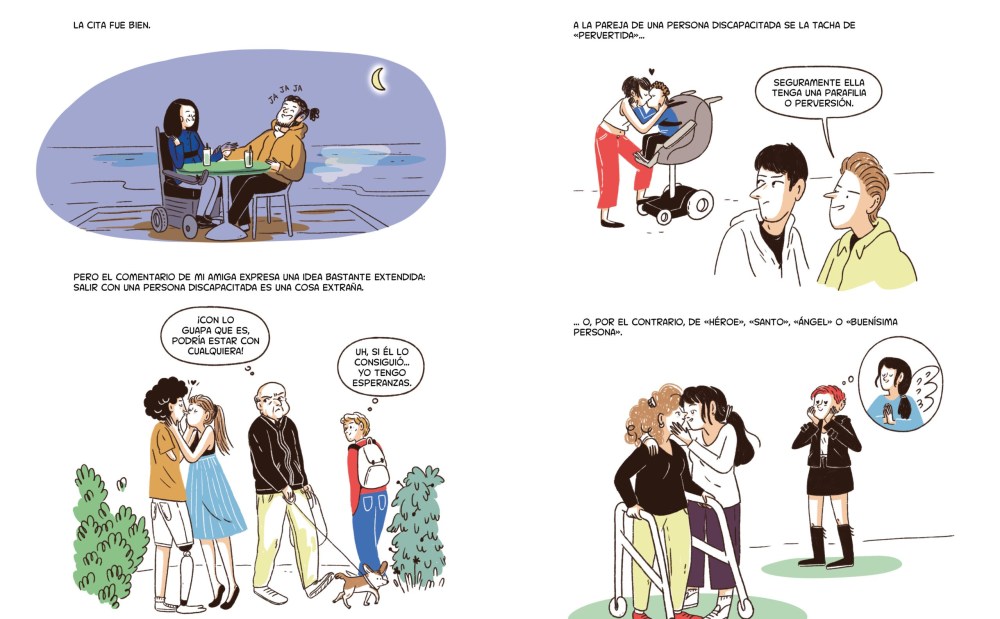 El tebeo presenta ocho situaciones distintas de la vida cotidiana, todas ellas protagonizadas por mujeres con discapacidad. No hay heroínas inspiradoras ni víctimas trágicas. Hay personas reales enfrentándose a la vida actual: el de la universidad que no tiene rampas, el del médico que infantiliza, el del desconocido que toca sin permiso, el de la amiga que felicita por “atreverse a bailar”. Cada historia es una escena que muchas personas lectoras sin discapacidad reconocerán desde el otro lado del espejo. Porque lo que las autoras hacen con una maestría impresionante es invertir la mirada: no se trata de observar a la persona discapacitada, sino de examinar cómo la sociedad la observa.