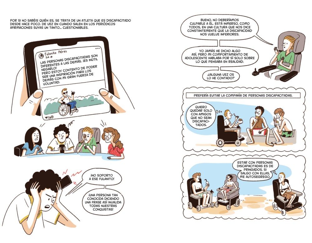 Uno de las cosas más interesantes del cómic es como aborda el capacitismo interiorizado. Esa forma de opresión en la que la persona con discapacidad ha asumido que es inferior a los demás y cree que “molesta”, que “pide demasiado” o que “debería agradecer siempre”. Este concepto es central para entender cómo la discriminación no solo es externa, sino que puede vivir dentro de la propia subjetividad. La lucha, entonces, no es solo contra el entorno, sino también contra la culpa, la vergüenza y el silenciamiento que han sido impuestos históricamente. Pocas obras lo abordan con tanta sensibilidad, sin paternalismo, sin victimismo, y con una lucidez que desarma.
